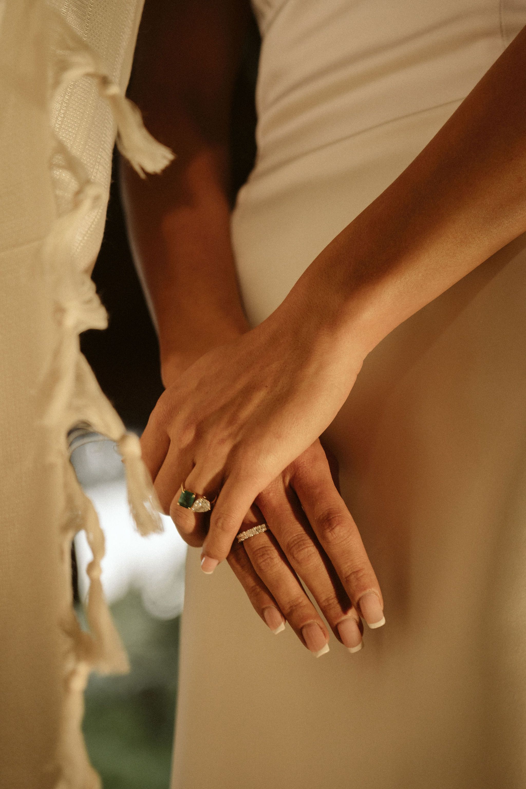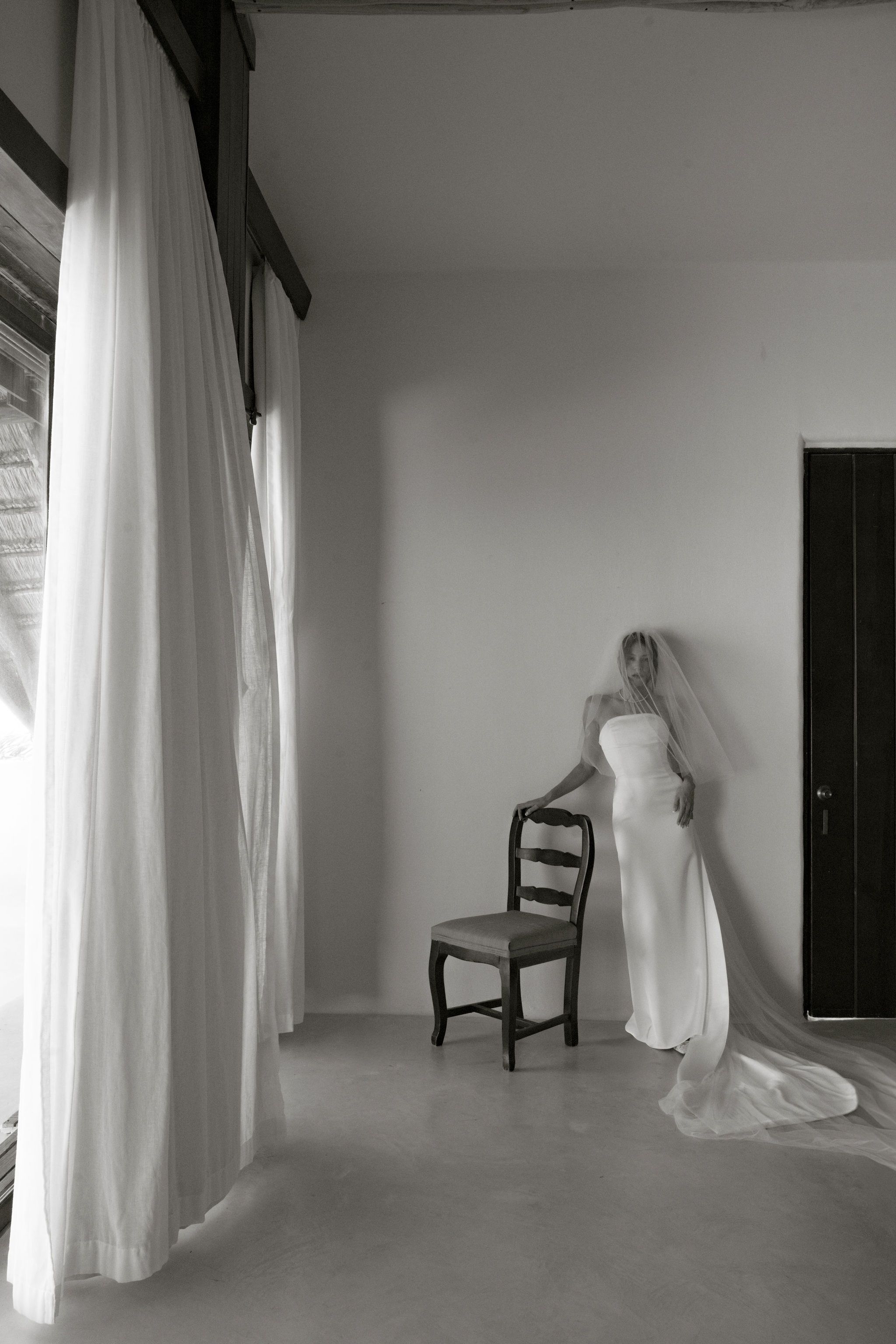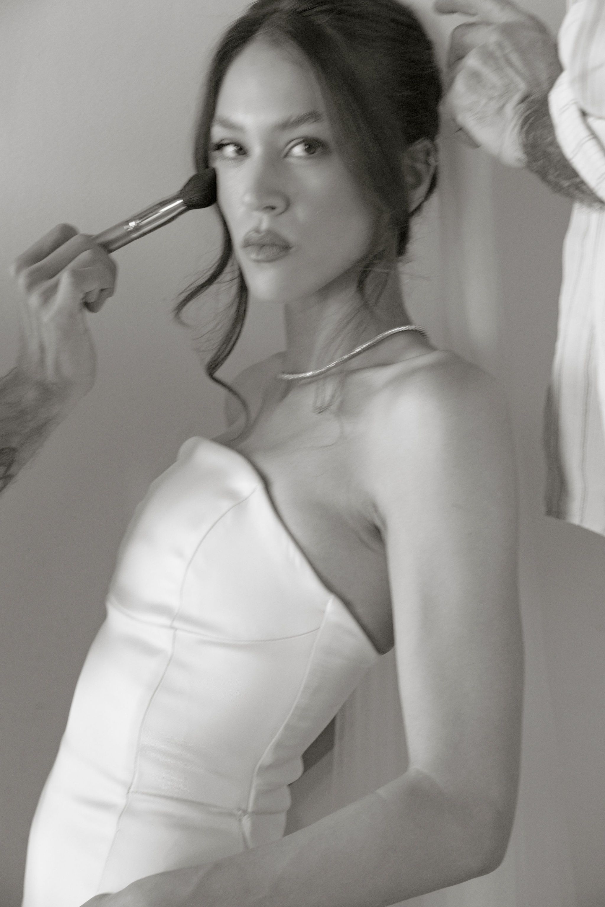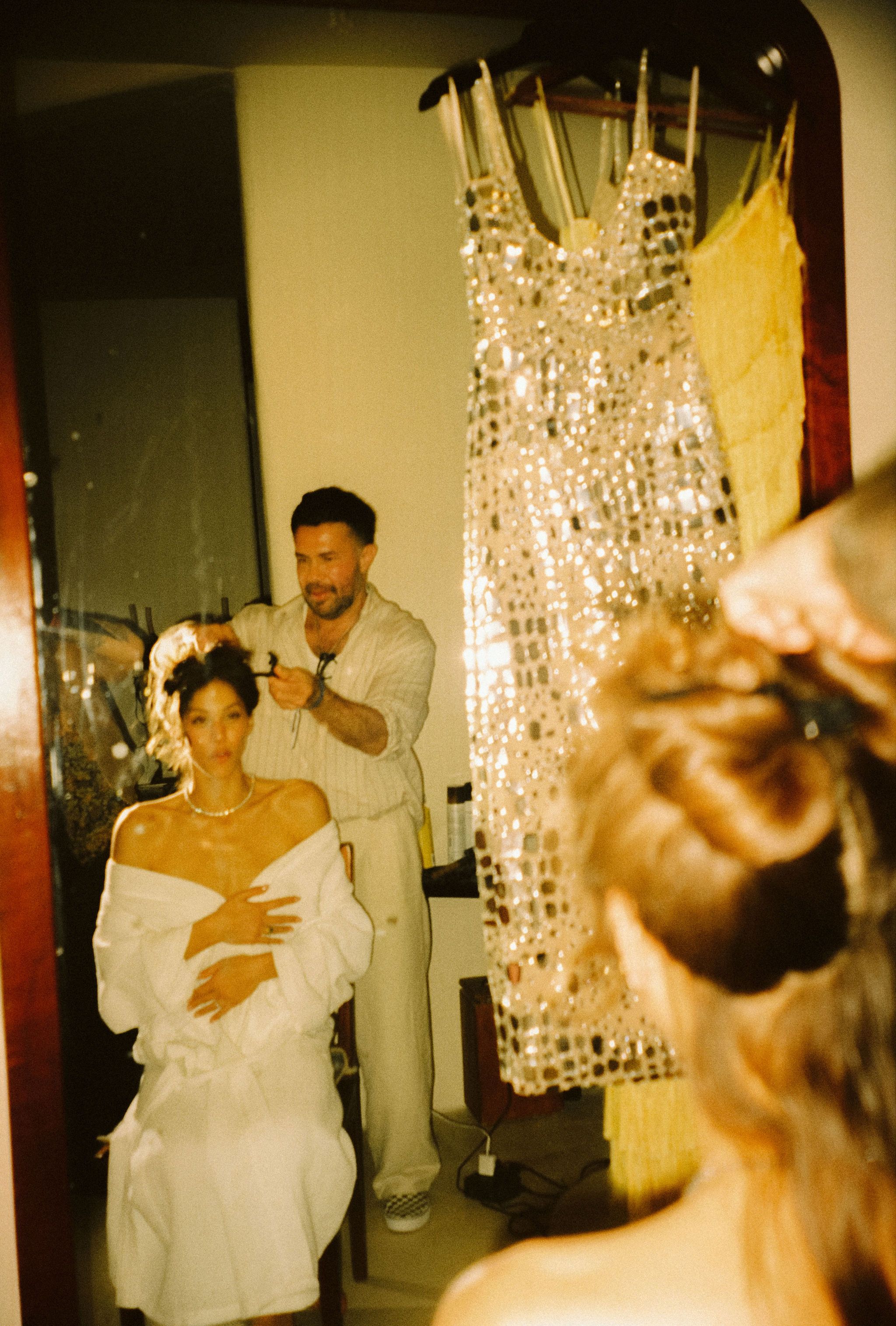 “When it came time for the bride to get dressed, we actually moved a very heavy mirror out of the way so we could access a clean wall next to natural light and stay consistent with the minimal aesthetic I was aiming for. I also had the bridesmaids change into their gowns before helping the bride into hers. While the traditional silky pajama getting-ready moments can be fun, I personally prefer the visual elegance of having the bridesmaids already dressed. It creates a richer, more refined frame and is also a great way to incorporate their dresses into the story of the morning.”