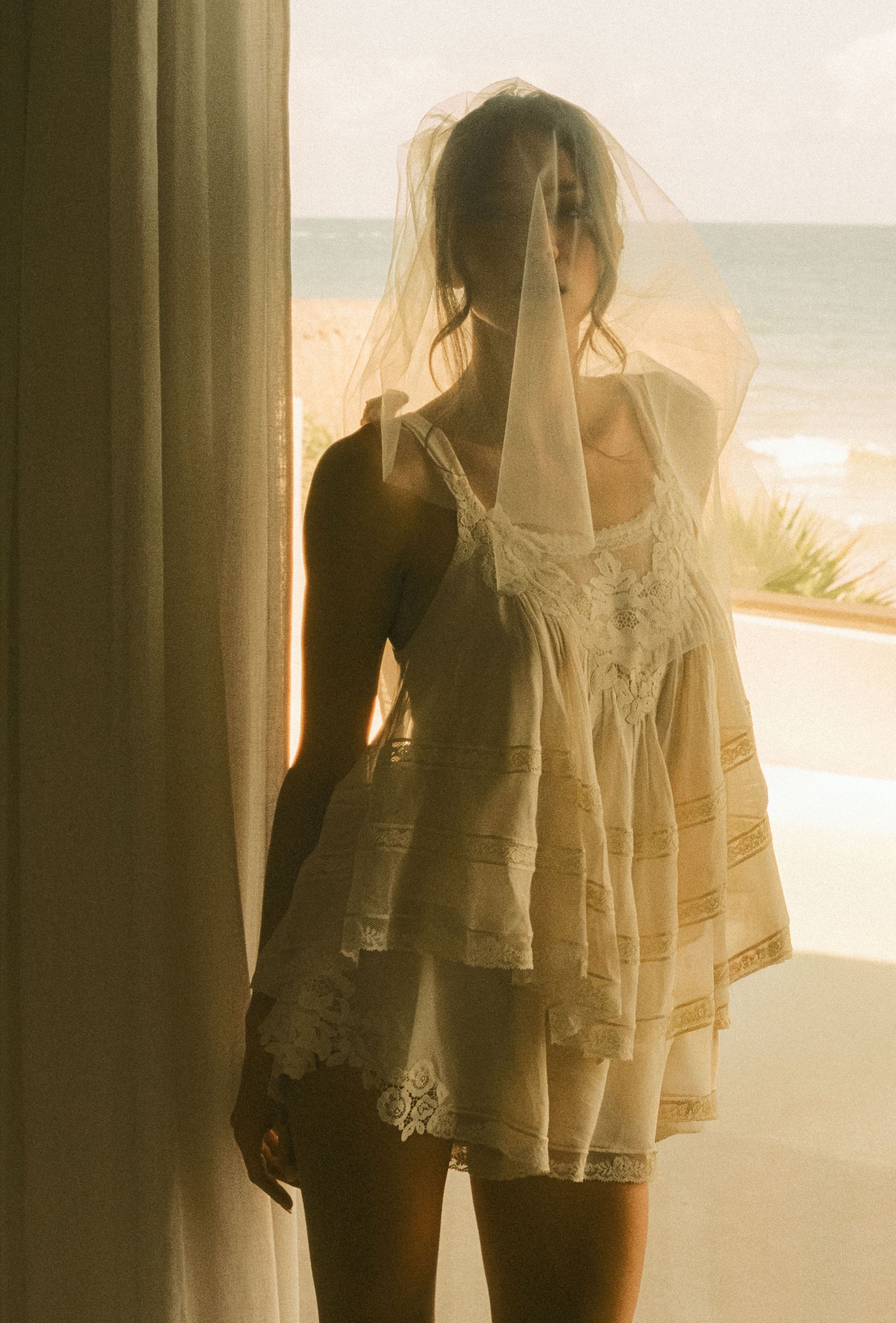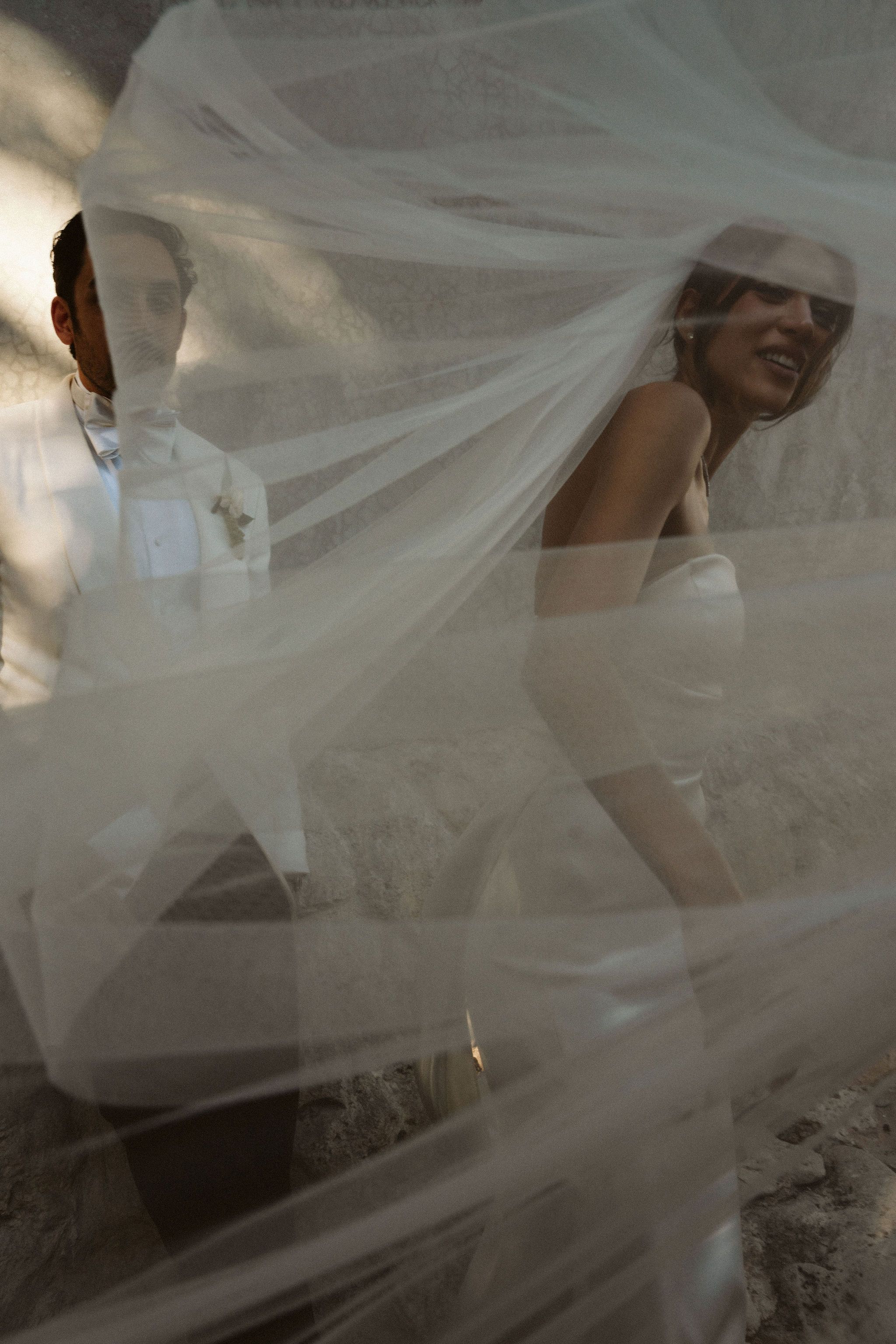 This spot was just beside the ceremony space. The bride’s feet were absolutely done at that point, so we slipped over there for a minute to cool off and catch the ocean breeze. While we were standing there, I noticed this beautiful speckled light filtering through the trees. I asked them to lean back together and just take a quiet moment. Aside from the gentle direction, everything in this image is completely authentic, the barefoot bride giving her feet a break, the wind moving through the veil, and the two of them just enjoying a pause together. Shot on my Sony using only natural light. No setup, no fuss, just a little luck, great light, and a couple in the moment