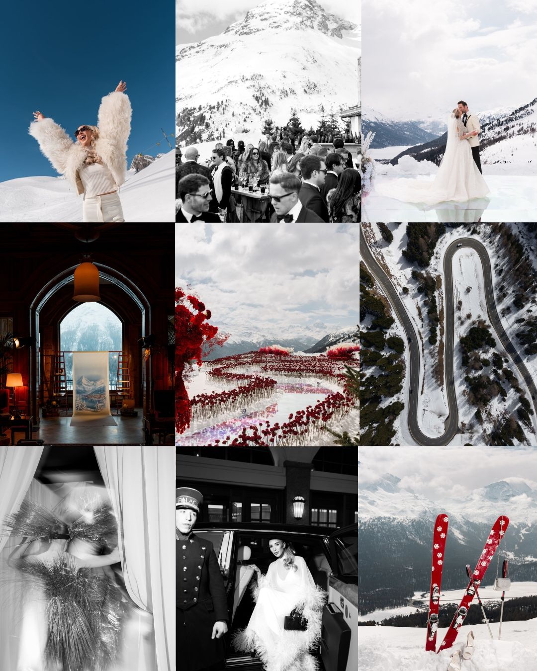 A ceremony at 3000m. Installations and florals flown in by helicopter. The photography team moving on skis just to stay in position. The groom arriving on a snowboard. THIS is a wild and unique place to capture a wedding.